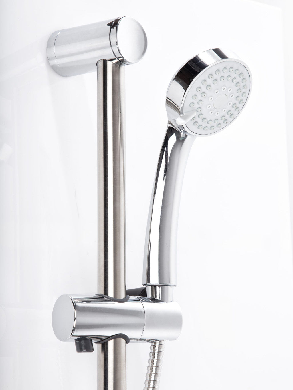 A rúd ütésálló, krómozott ABS-borítású; a PVC-tömlő belsejében sima falú járat található, amelyben kevésbé tapad meg a vízkő. A teljes szett porszórt krómkupakkal rejti a csavarokat, így a dizájn homogén marad.