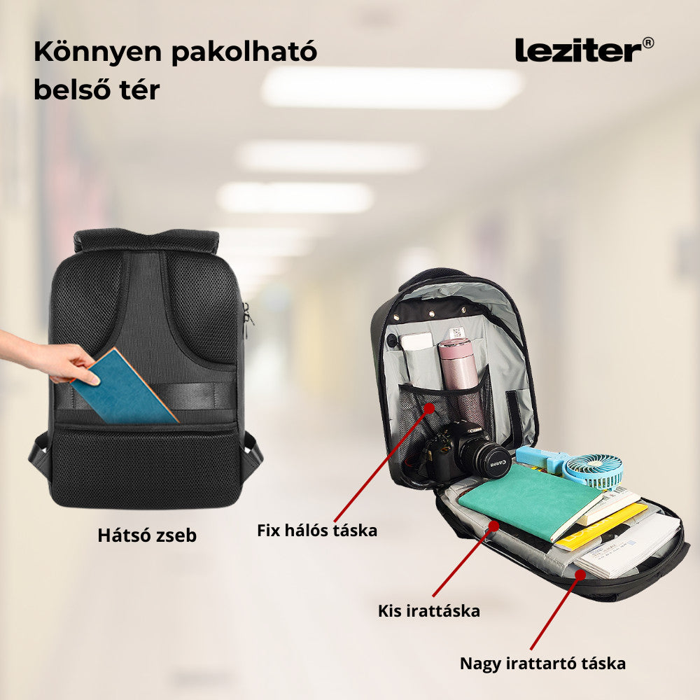 - Könnyen pakolható belső tér – többféle rekesz: fix hálós zseb, kis és nagy irattáska, hátsó biztonsági zseb