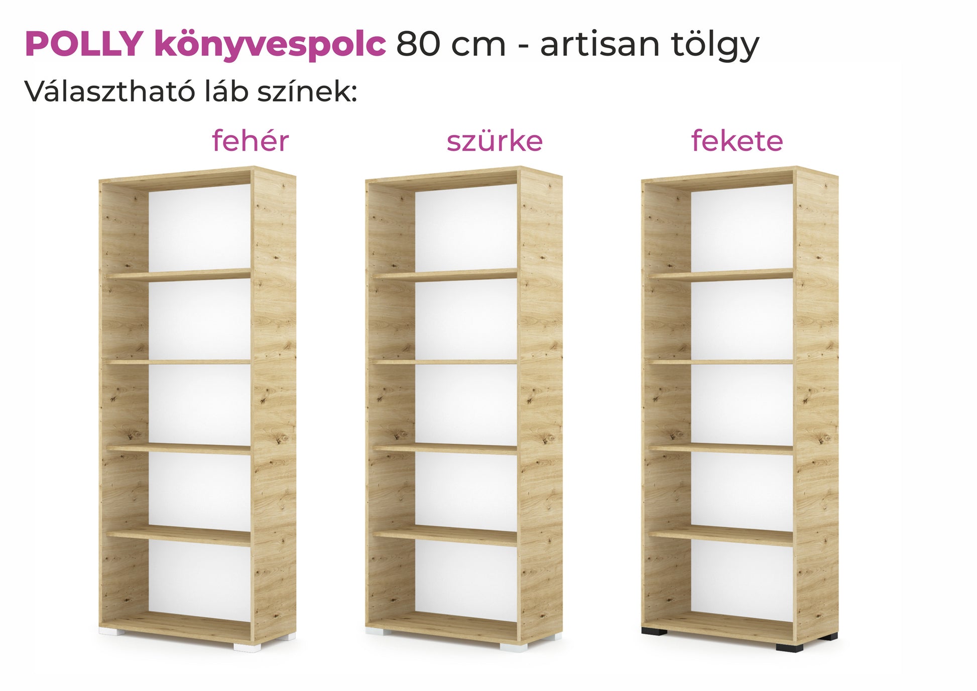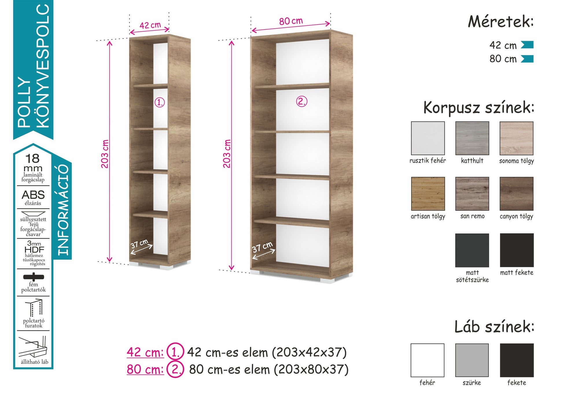 Ha kellemes olvasósarokra vágyik, válassza 42 és 80 cm-es Polly könyvespolcainkat, melyeket tetszés szerint kombinálhat. Remek tárolóhelyet biztosít nem csupán a könyvek, de a különböző dekorációs tárgyak számára is. Több színben kapható: rusztik fehér, katthult, sonoma tölgy, artisan tölgy, san remo, canyon tölgy, matt sötétszürke és matt fekete.