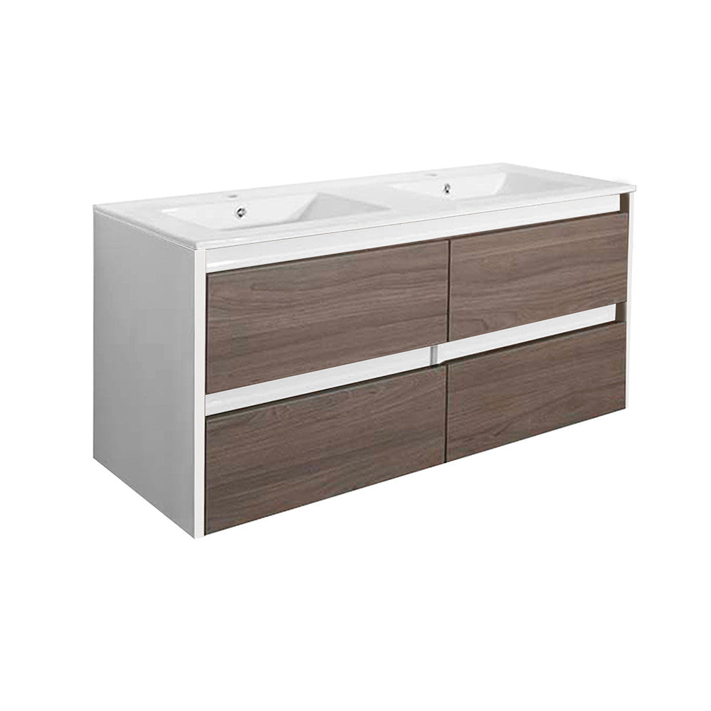 A csomag része a bútorra tökéletesen illeszkedő, fehér színű, dupla medencés kerámia mosdó is, amely két csaptelep számára kialakított hellyel rendelkezik. Így nem kell külön keresgélned hozzá megfelelő mosdót – a csomag mindent tartalmaz, amire a használathoz szükséged van (kivéve a csaptelepeket).