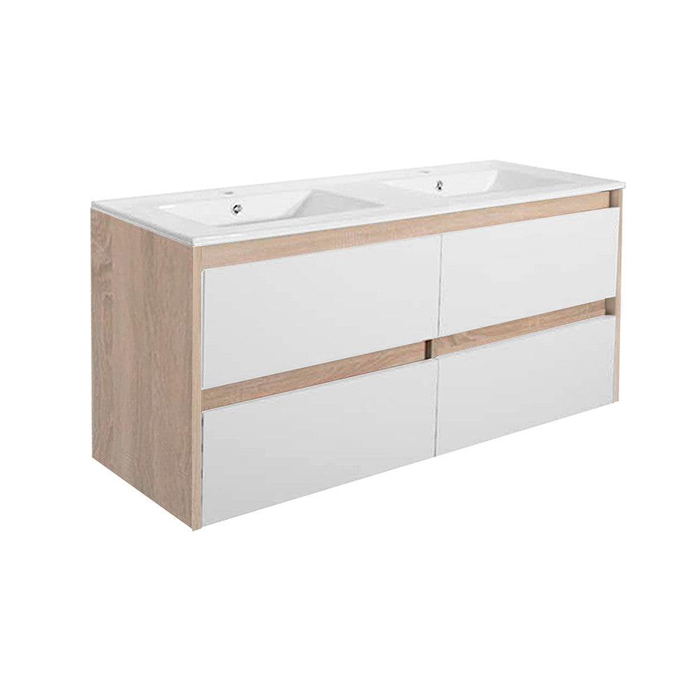 A csomag része a bútorra tökéletesen illeszkedő, fehér színű, dupla medencés kerámia mosdó is, amely két csaptelep számára kialakított hellyel rendelkezik. Így nem kell külön keresgélned hozzá megfelelő mosdót – a csomag mindent tartalmaz, amire a használathoz szükséged van (kivéve a csaptelepeket).