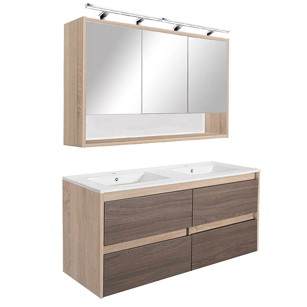 A csomag része a bútorra tökéletesen illeszkedő, fehér színű, dupla medencés kerámia mosdó is, amely két csaptelep számára kialakított hellyel rendelkezik. Így nem kell külön keresgélned hozzá megfelelő mosdót – a csomag mindent tartalmaz, amire a használathoz szükséged van (kivéve a csaptelepeket).