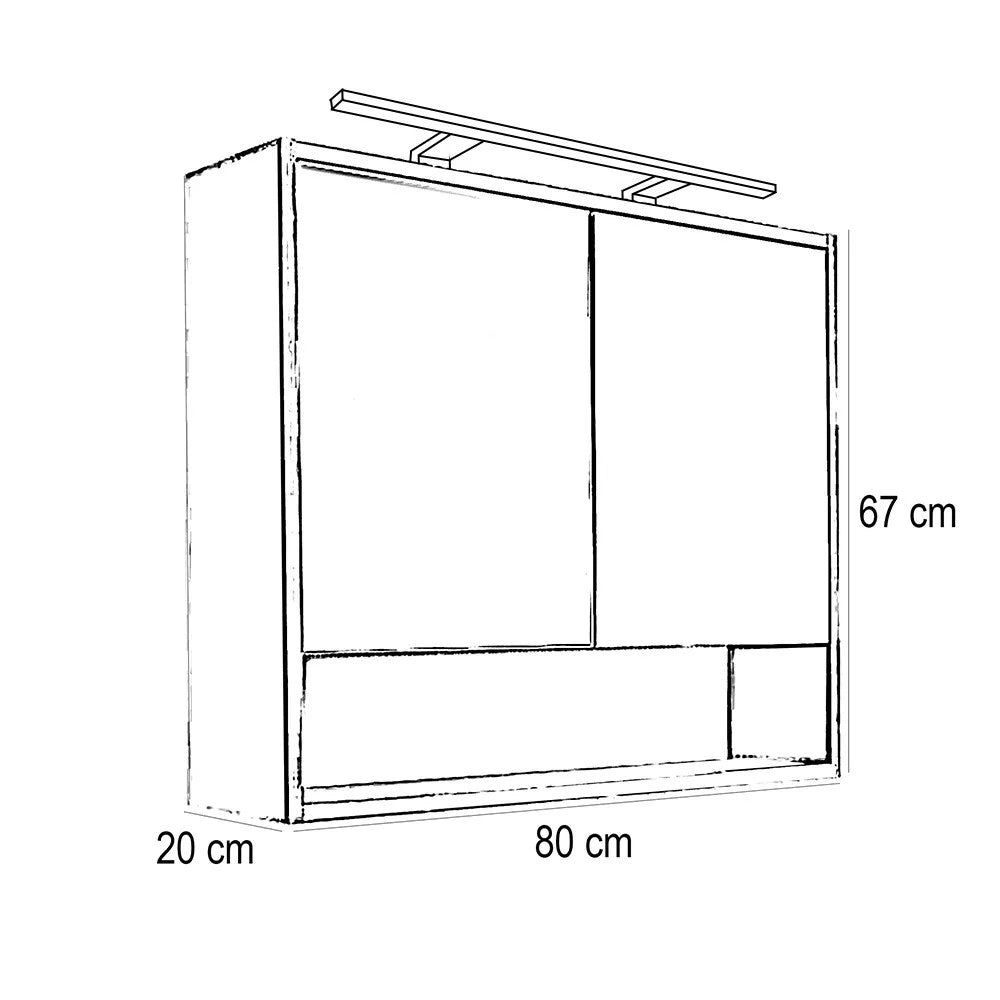 A szett részét képezi egy felfüggesztett kivitelű felső bútor is, amely 80 × 67 × 20 cm-es méretével további tárolási lehetőséget kínál. Tükrös ajtói mögött zárt polcos rész található, alul pedig egy praktikus nyitott polc kapott helyet, így a leggyakrabban használt tárgyak is kézre esnek. A felső egység is fehér színű, magas minőségű bútorlapból készült.