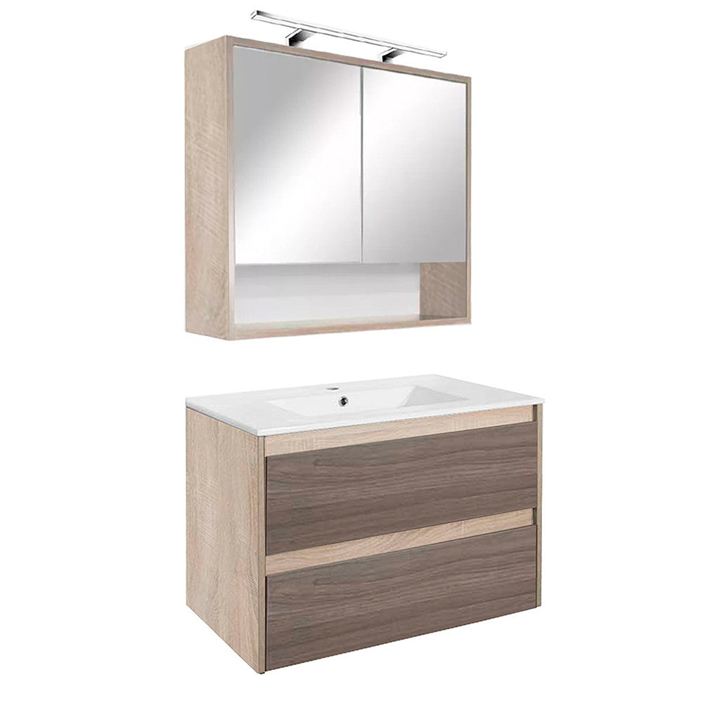 A szett részét képezi egy felfüggesztett kivitelű felső bútor is, amely 80 × 67 × 20 cm-es méretével további tárolási lehetőséget kínál. Tükrös ajtói mögött zárt polcos rész található, alul pedig egy praktikus nyitott polc kapott helyet, így a leggyakrabban használt tárgyak is kézre esnek. A felső egység is sonoma tölgy színű, magas minőségű bútorlapból készült.
