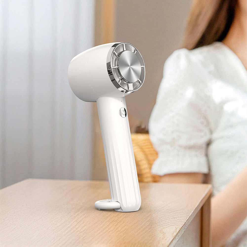 A ventilátor állítható döntési szögének köszönhetően nemcsak kézben használható, hanem stabilan az asztalra is állítható – így írás, munka vagy sminkelés közben is élvezheted a hűsítő hatást.