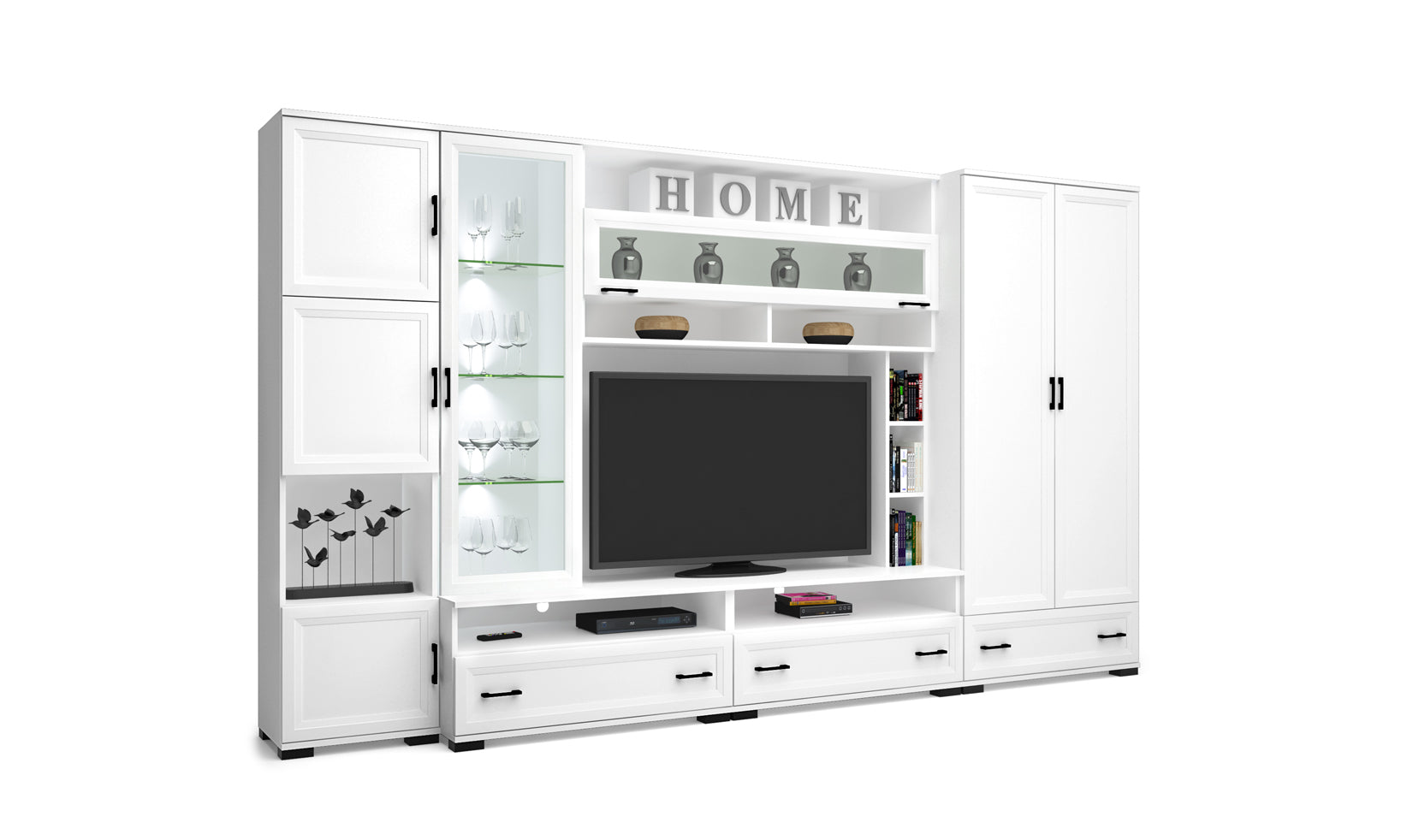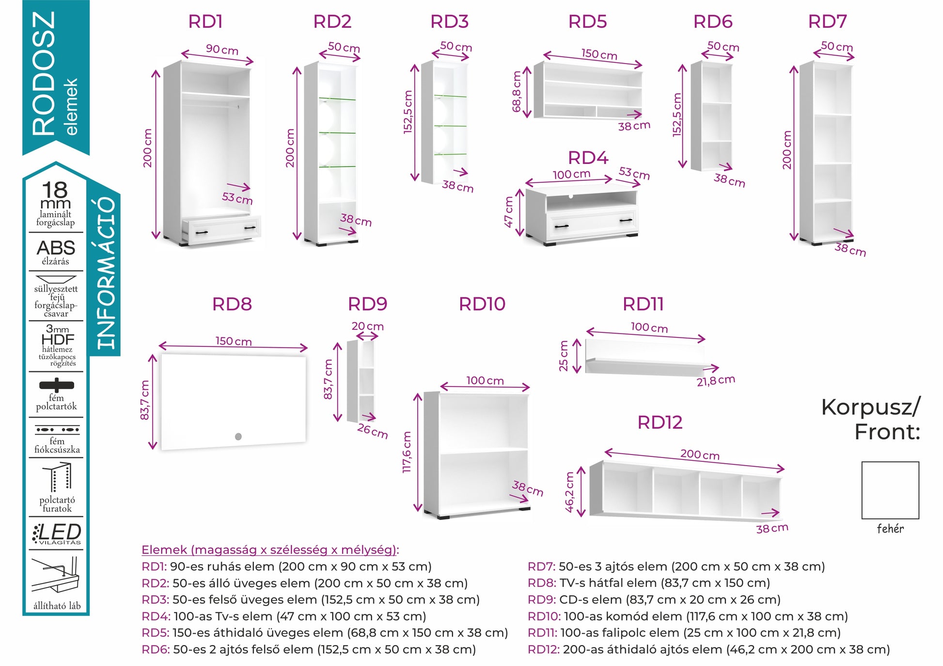 A Rodosz szekrénysor 340cm-es, illetve 390 cm-es kialakításban, fehér színben kapható. A hagyományos szekrénysorok táborát erősíti. Megjelenésével eleganciát varázsol az otthonokba, ezért megállja a helyét akár egy modernebb szemlélettel rendelkező, akár egy hagyományosabban kialakított lakásban is. Hangulatát fokozzák a leddel megvilágított üvegpolcai is. Jól pakolható, könnyen hozzáférhető tárolók.