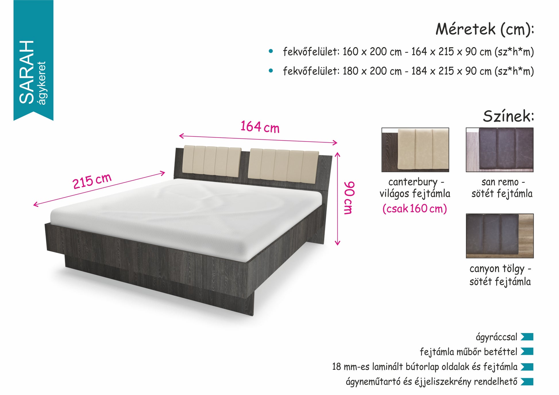 A SARAH ágykeret műbőr betétes háttámlájának köszönhetően a különleges kidolgozottságú termékek táborát gazdagítja. A műbőr nem csupán remekül mutat, de kényelmes is a mindennapokban. Színét tekintve több lehetőség közül lehet választani, hiszen nem csupán a műbőr, de a fa színe is több árnyalatban választható. A canterbury ágykerethez világos fejtámla, a san remo és ferrara tölgy ágykerethez pedig sötét fejtámla kapható. A termékhez ágyneműtartó és éjjeliszekrény is vásárolható. Két méretben kapható: 160x200 és 180x200 cm.18mm-es bútorlap oldalak, fejtámla műbőr betéttel, ágyrács.