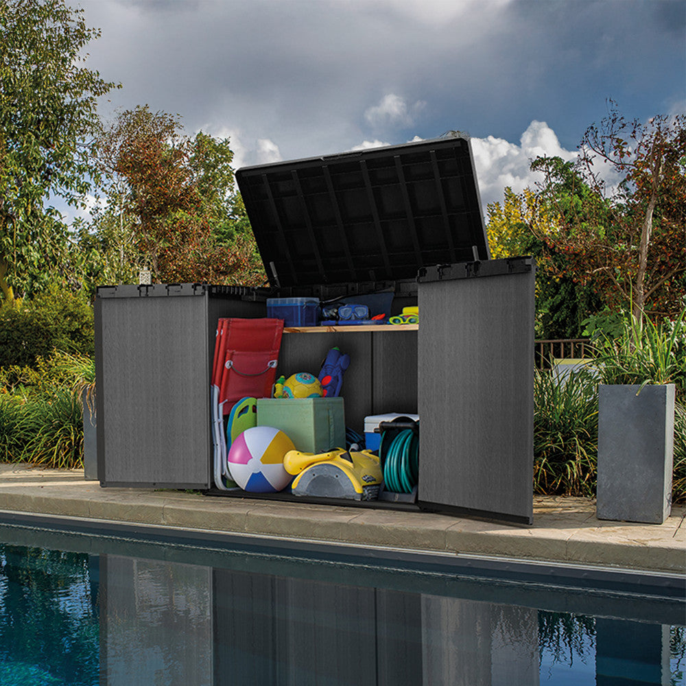 A 1100 literes kapacitás lehetővé teszi, hogy minden fontos kerti kelléket egy helyen tárolj – legyen szó párnákról, grillezőről, szerszámokról vagy locsolótömlőről. A felnyitható tető és a kétszárnyú ajtó könnyű hozzáférést biztosít, így egy pillanat alatt megtalálod, amire szükséged van.