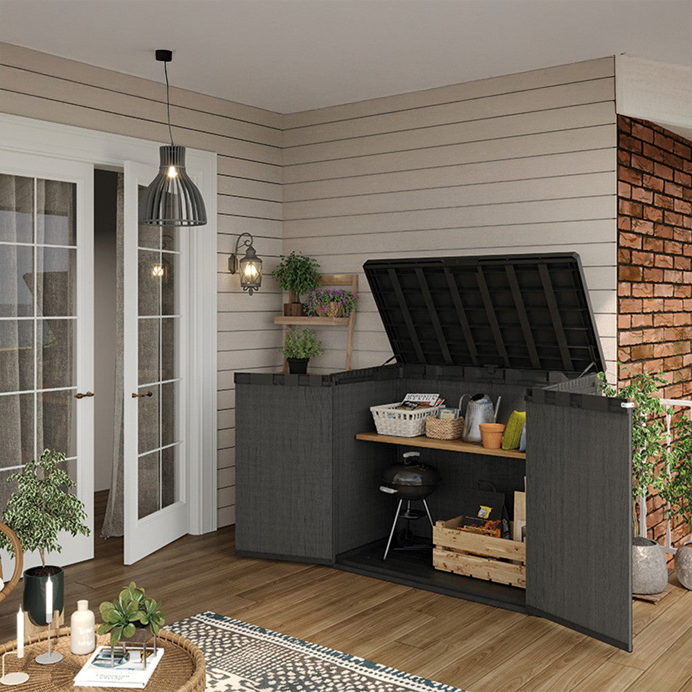 A 1100 literes kapacitás lehetővé teszi, hogy minden fontos kerti kelléket egy helyen tárolj – legyen szó párnákról, grillezőről, szerszámokról vagy locsolótömlőről. A felnyitható tető és a kétszárnyú ajtó könnyű hozzáférést biztosít, így egy pillanat alatt megtalálod, amire szükséged van.
