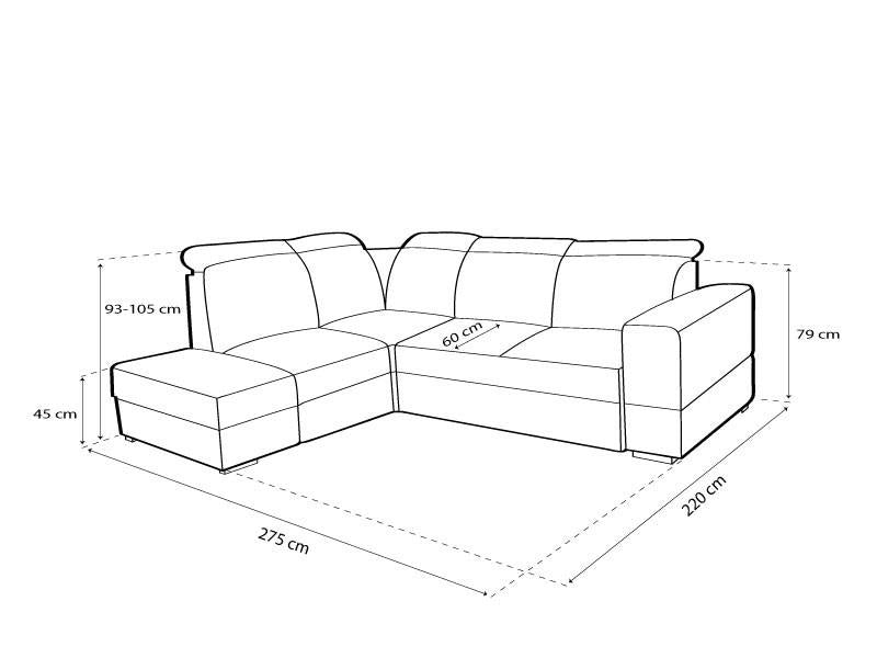 külső méret: 275 x 220 cm, fekvőfelület: 200 x 124 cm, ülőmagasság: 45 cm, beülőmélység: 60 cm, háttámlamagasság: 79 cm, magasság: 93-105 cm