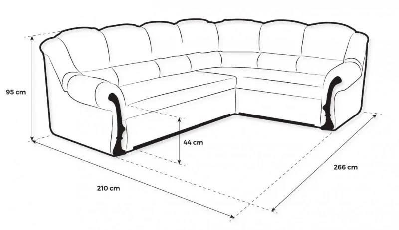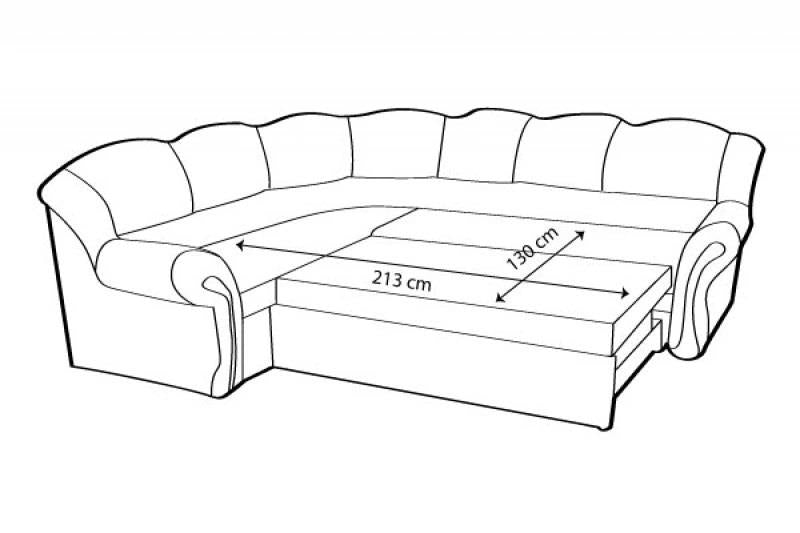 külső méret: 210 × 266 cm, fekvőfelület: 130 × 213 cm, ülőmagasság: 44 cm, beülőmélység: 56 cm, háttámlamagasság: 95 cm