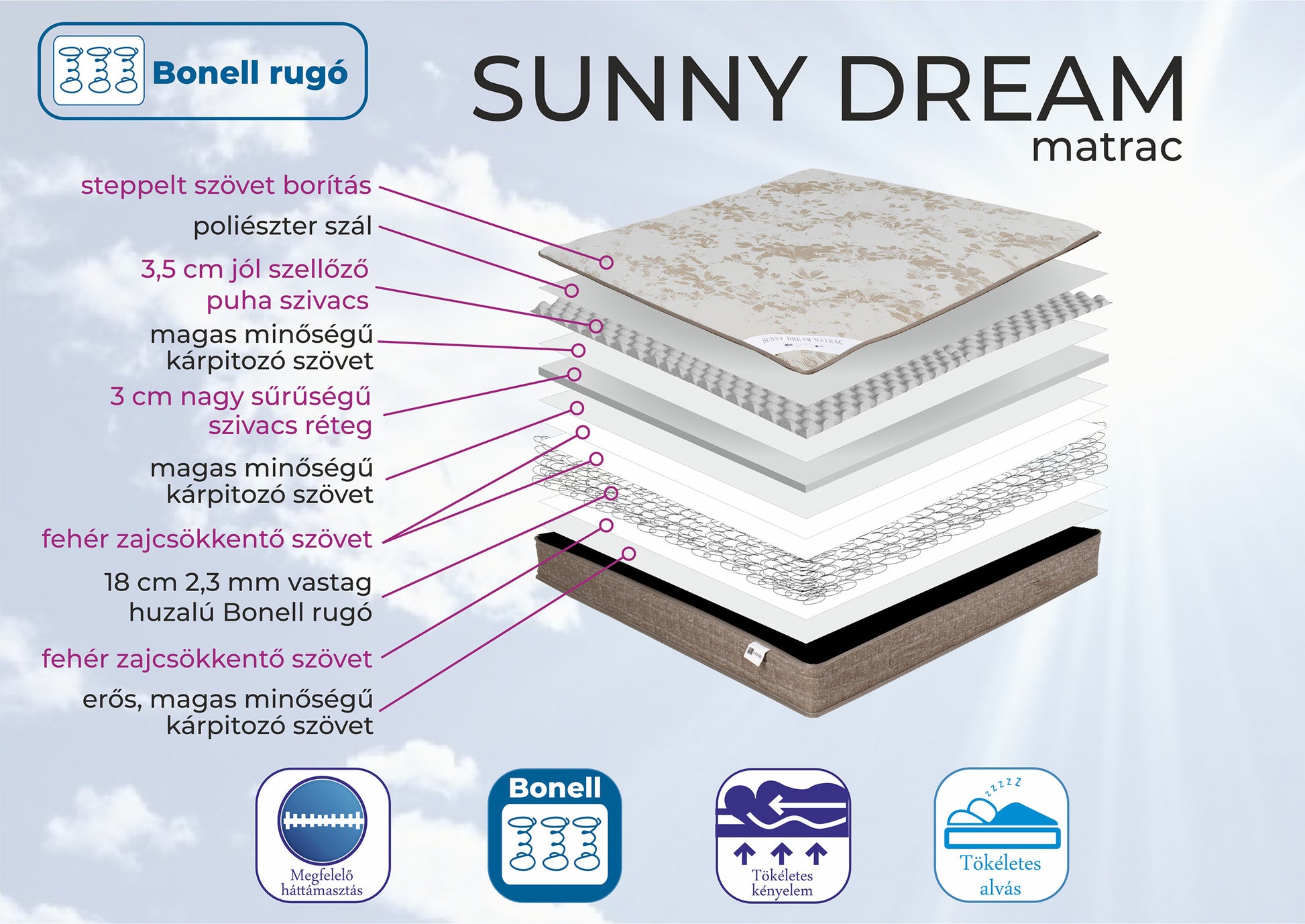 24 cm magas, egyoldalas matrac, mely keménységét tekintve inkább a puha matracok közé sorolható. Felépítése: 18 cm magas Bonell rugói stabil és rugalmas alátámasztást nyújtanak a teljes test számára; 6 cm különböző sűrűségű és keménységű rétegek a matracot egyedülállóan kényelmessé teszik és gondoskodnak a megfelelő ortopédiai alátámasztásról.