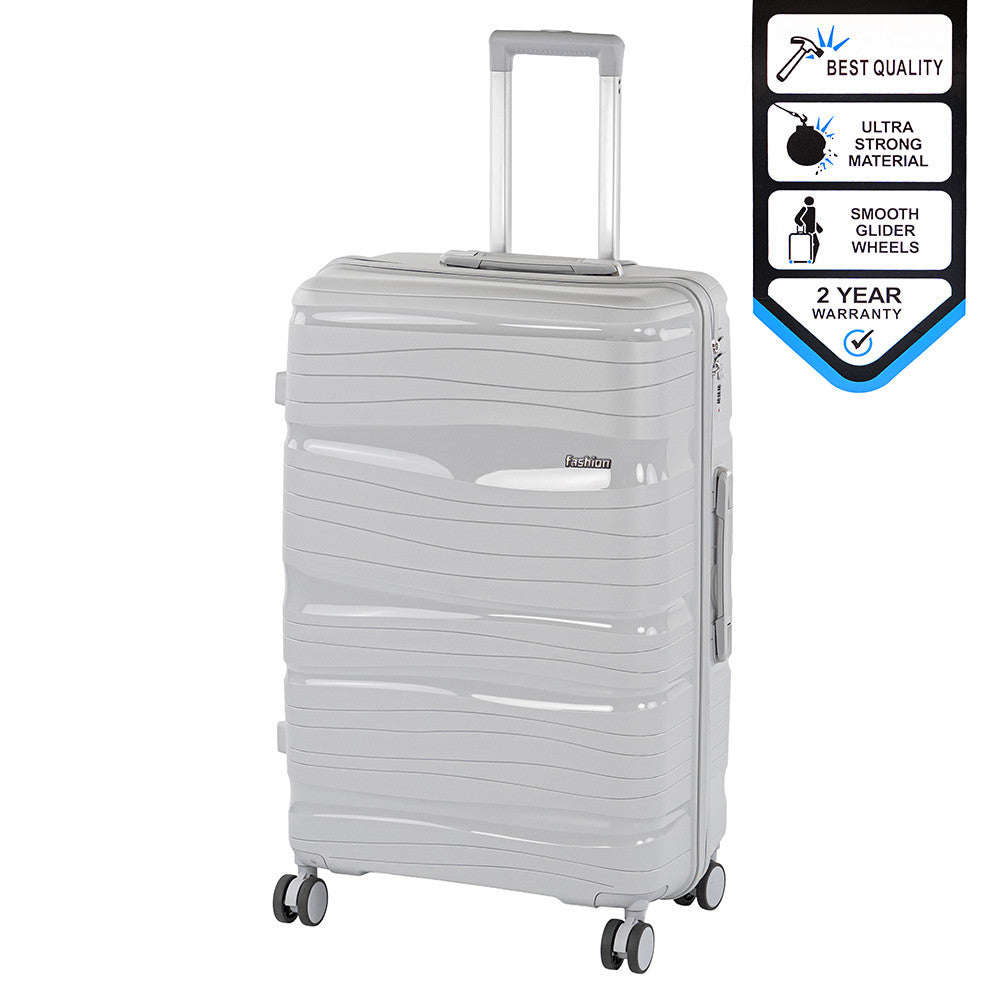 A szürke, hullámos dizájn egyszerre modern, letisztult és stílusos – bármilyen korosztály vagy utazási cél esetén megállja a helyét. Az anyagfelület strukturált, karcálló és ellenáll a kopásnak. A polipropilén (PP) külső borítás hőálló, vegyszerálló, nedvességálló és hosszú élettartamot biztosít.